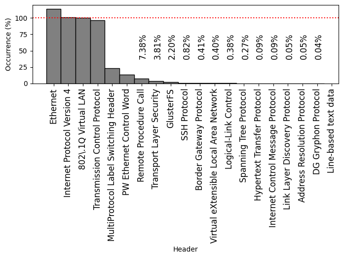 Frequently-occurring protocol headers on FABRIC:
